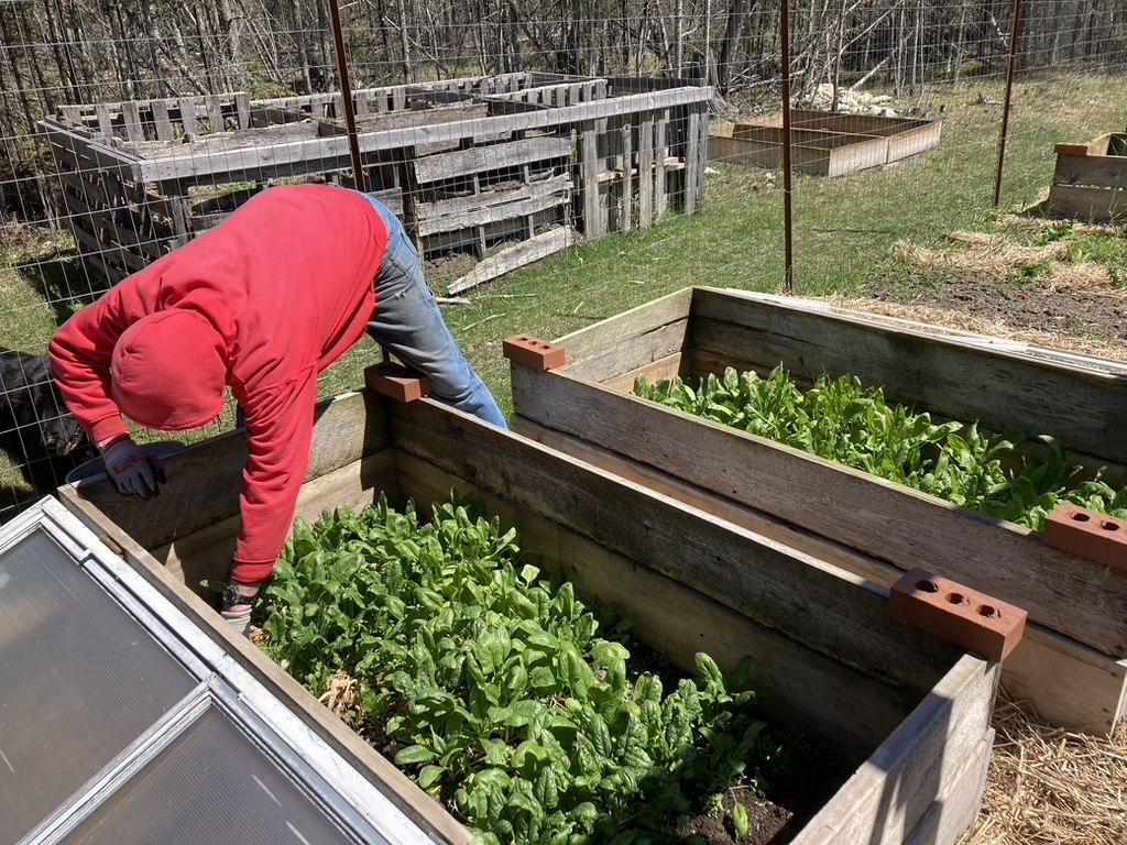 We were already rolling in abundance when we completed our eastward migration. YES! Cold frames filled with spinach. Three beds of successfully wintered-over cold kissed carrots. And year two of asparagus looking promising. One more year to go until we can start harvesting the new asparagus patch. Looks like the deer were sampling the goods – deer aren’t even supposed to like asparagus. Seems like the deer are getting more bold with their tasting options.
