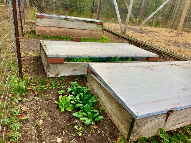 As we clean up the garden and prep it for winter, I soak up as much sunshine and dirt as possible to get me through the coming dark days. The Boss has deployed “The Fleet” of cold frames over our spinach and lettuce beds.